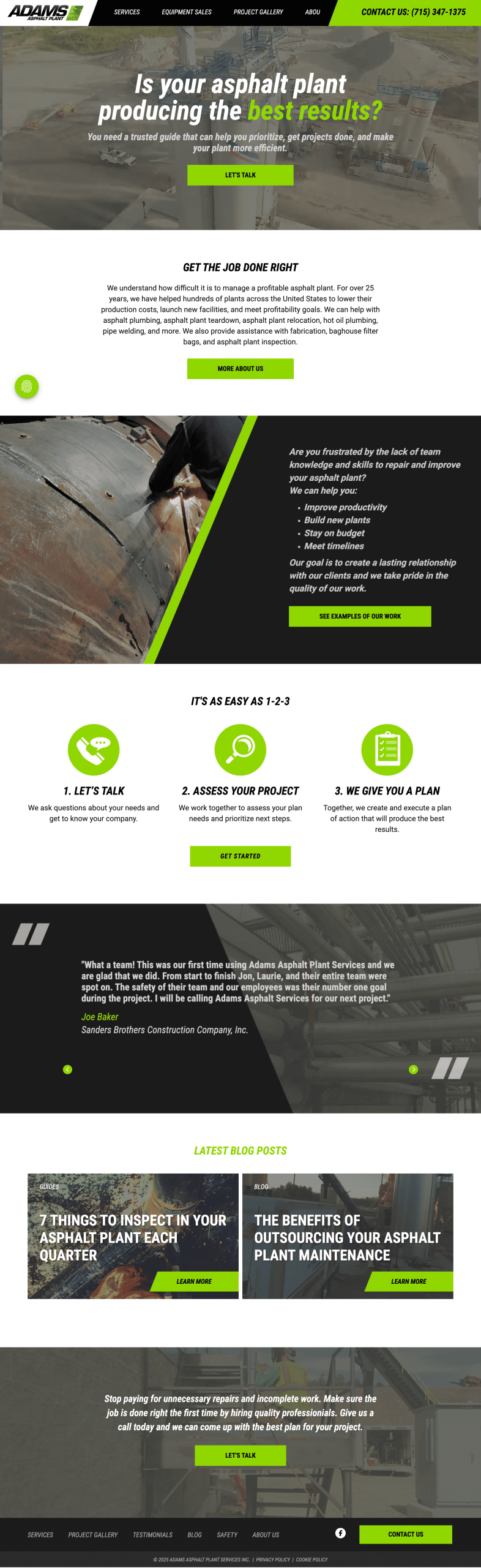 Adams Asphalt Plant Services, a family-owned business in Johnson Creek, WI, specializes in maintaining, repairing, and upgrading asphalt plants. Their existing website had become outdated and vulnerable due to unsupported plugins and a custom theme that could no longer be maintained. Security breaches, performance issues, and difficulty updating content made it clear that a stable rebuild was needed to support the company’s next stage of growth.