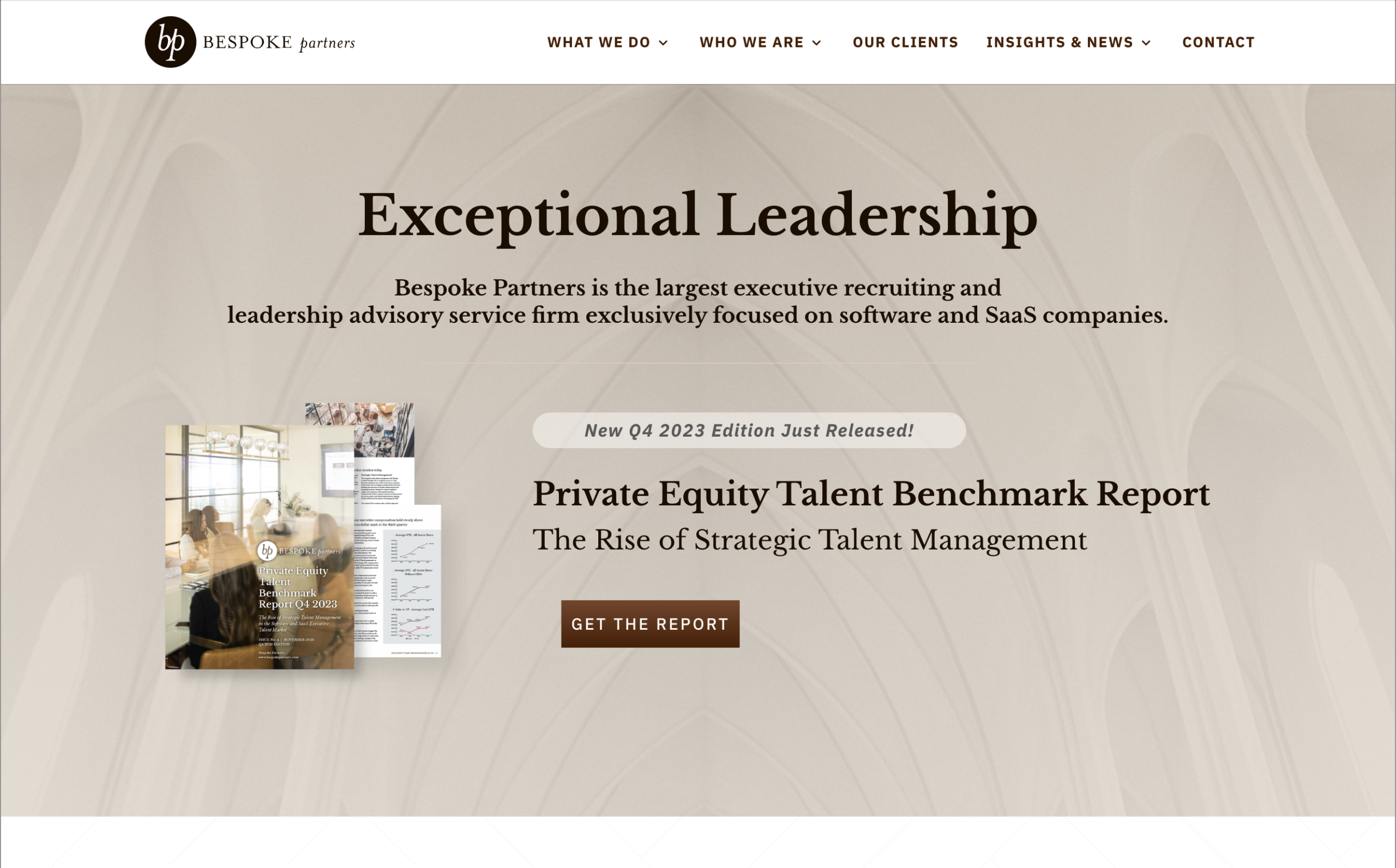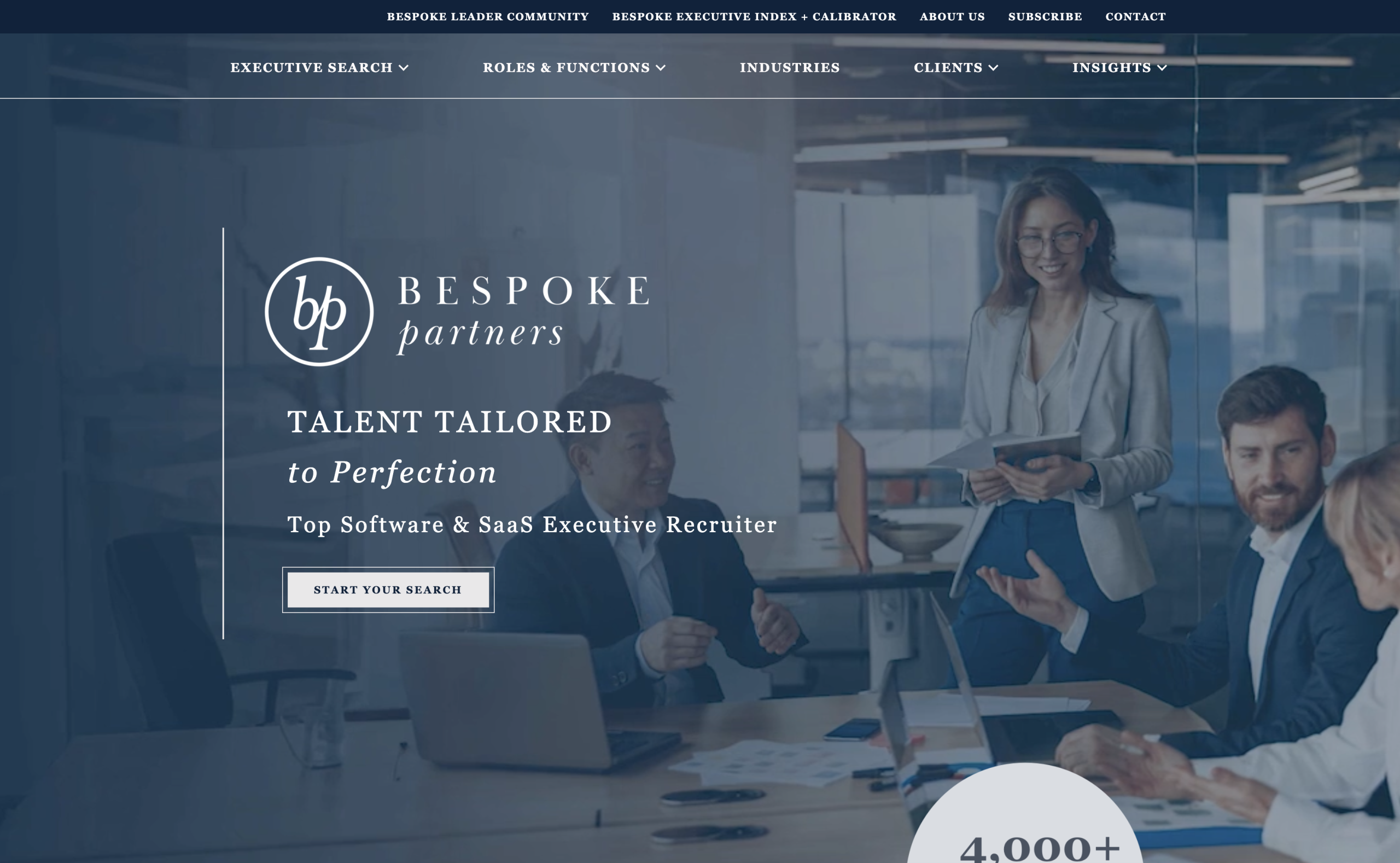 Bespoke Partners is one of the most specialized executive search firms in the country, focused exclusively on software and SaaS companies backed by private equity. With a network of over 700,000 executives, proprietary data tools, and a track record placing leaders at some of the most high-profile exits in the sector, their credibility in the room was never in question. They needed a website that matched the sophistication of their work, improved the backend experience for a content-heavy site, and visually set them apart from competitors without abandoning the brand equity they had already built.