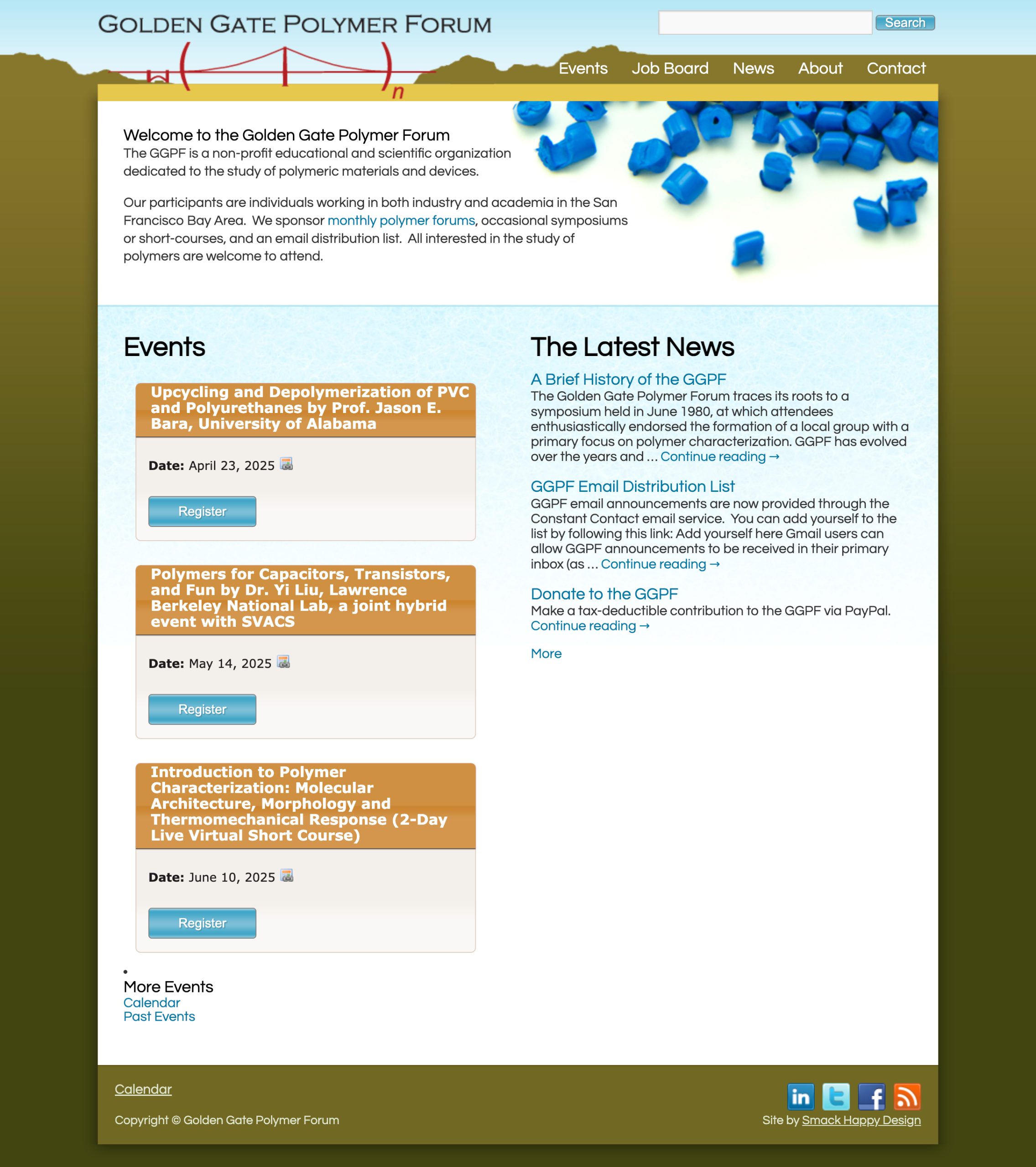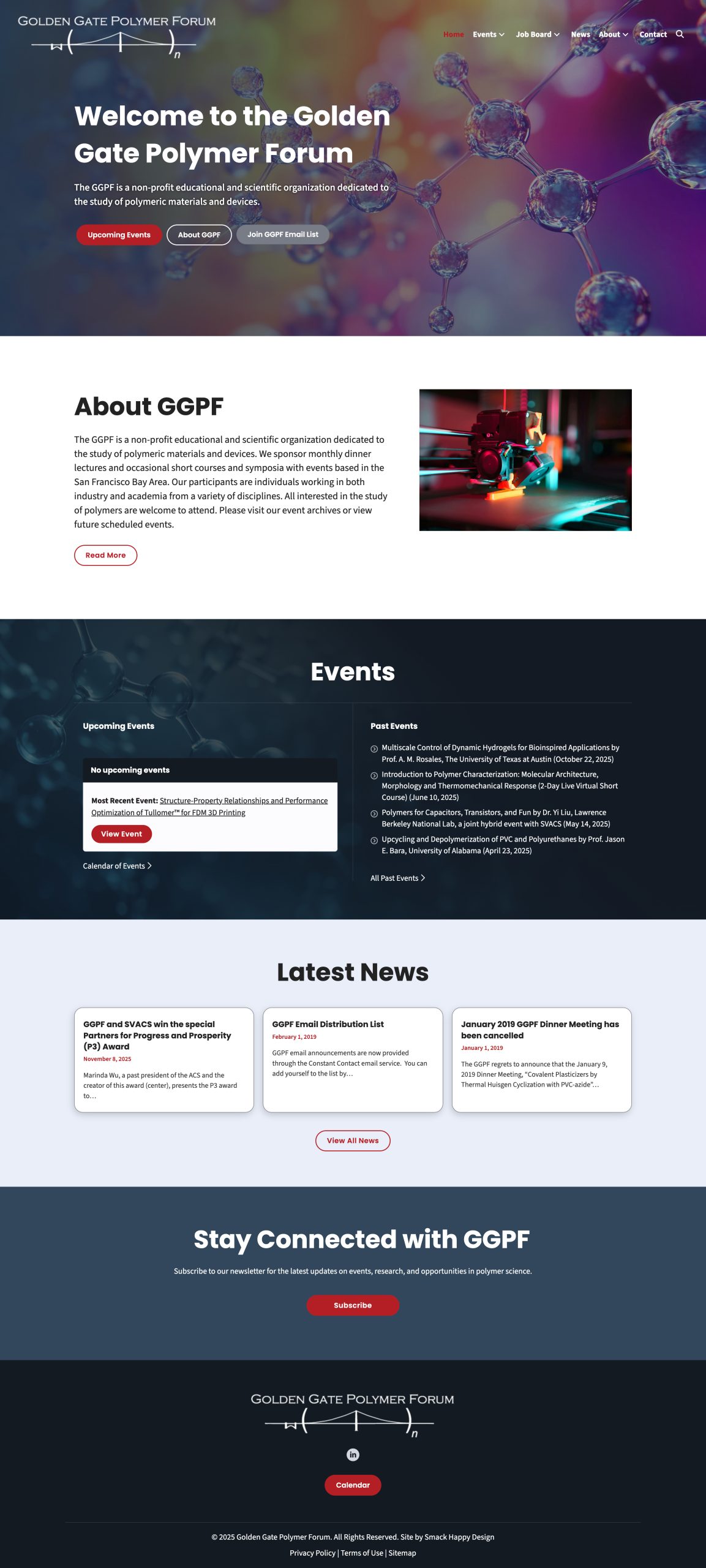 The Golden Gate Polymer Forum (GGPF), a long-standing nonprofit that brings together industry and academic professionals in polymer science, needed a modernized website to better support its community and ongoing events. Their existing site housed years of posts, past events, and event management tools but lacked a contemporary look and easy usability. Our task was to redesign the site, migrate all existing content, and improve how events and custom content is presented. Our goal was to elevate both design and functionality without disrupting their established systems.